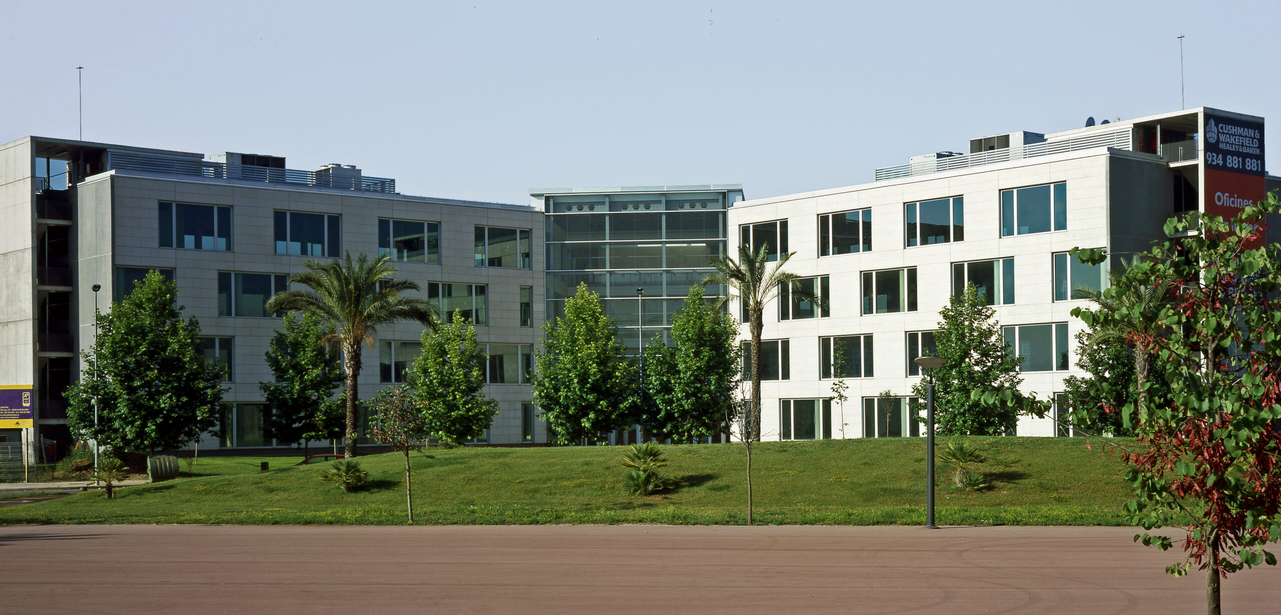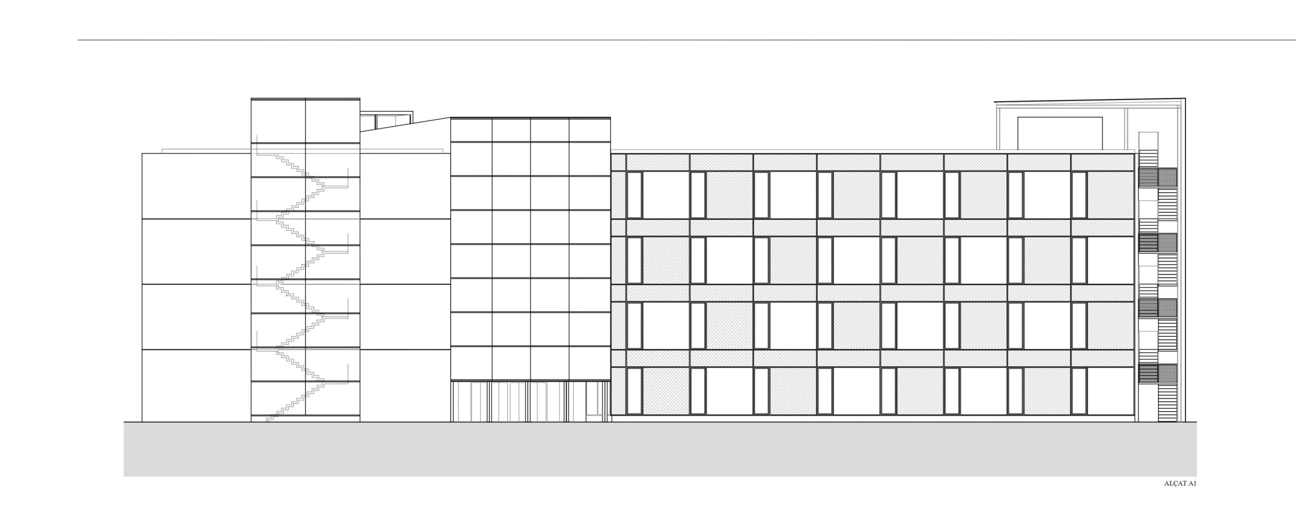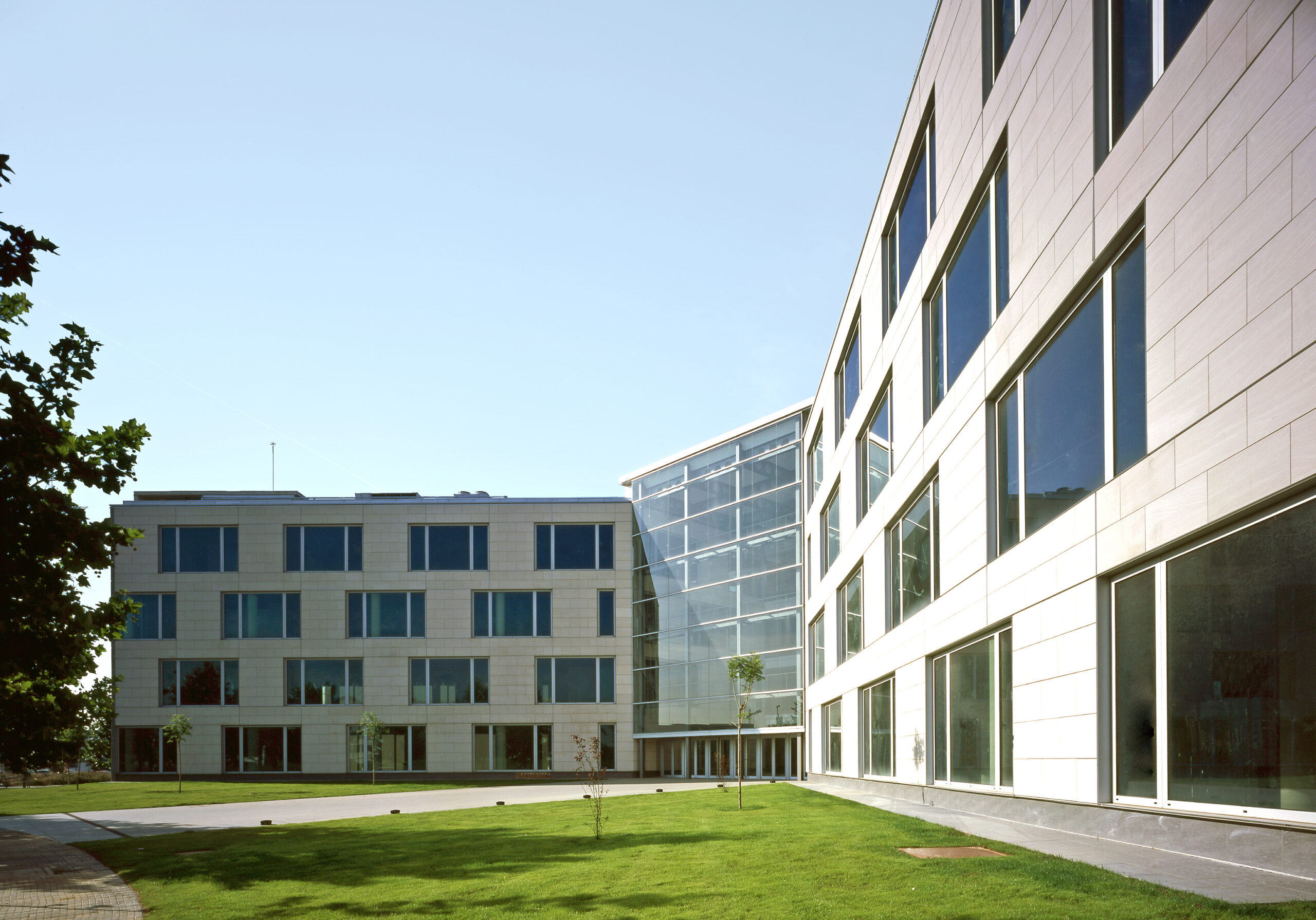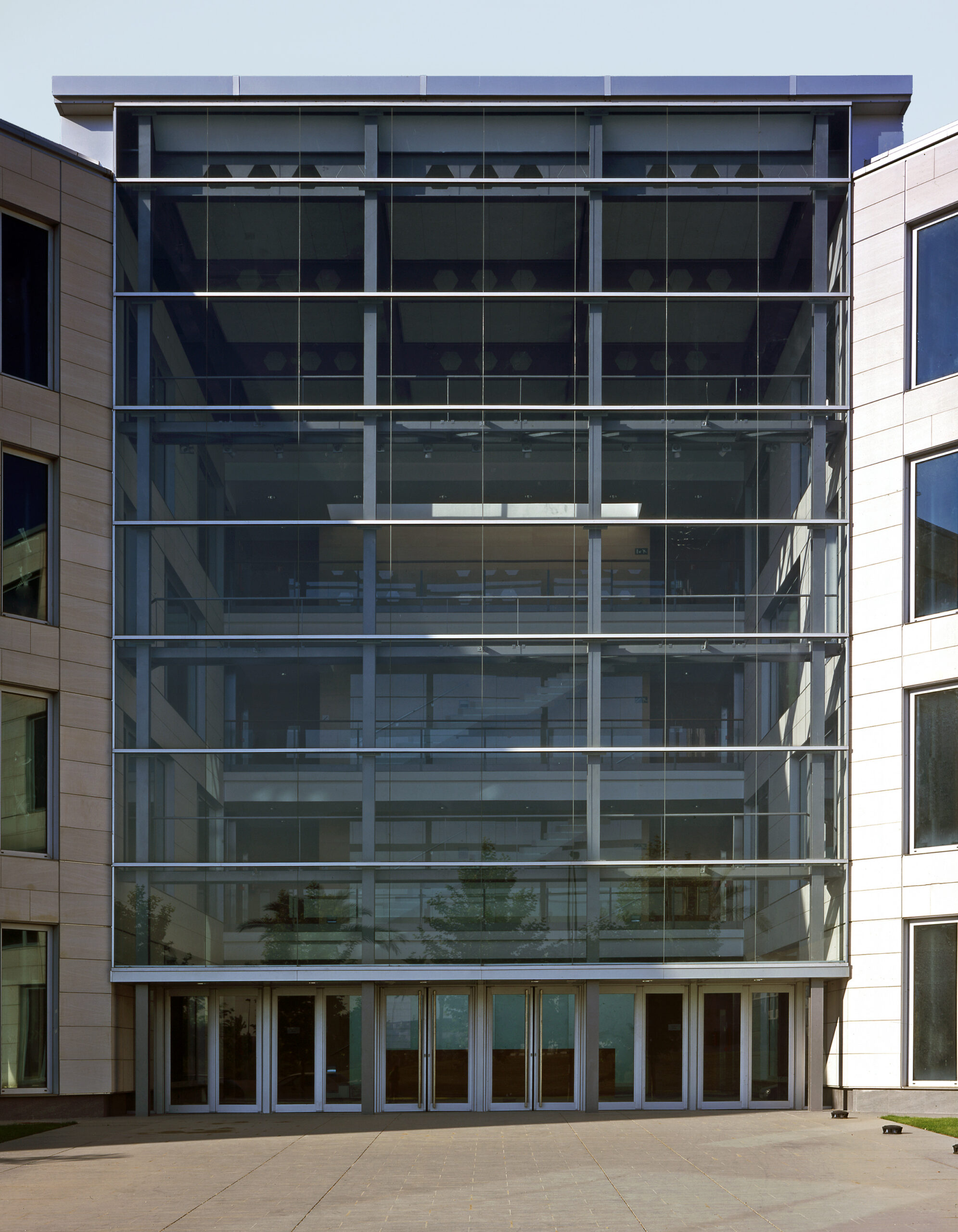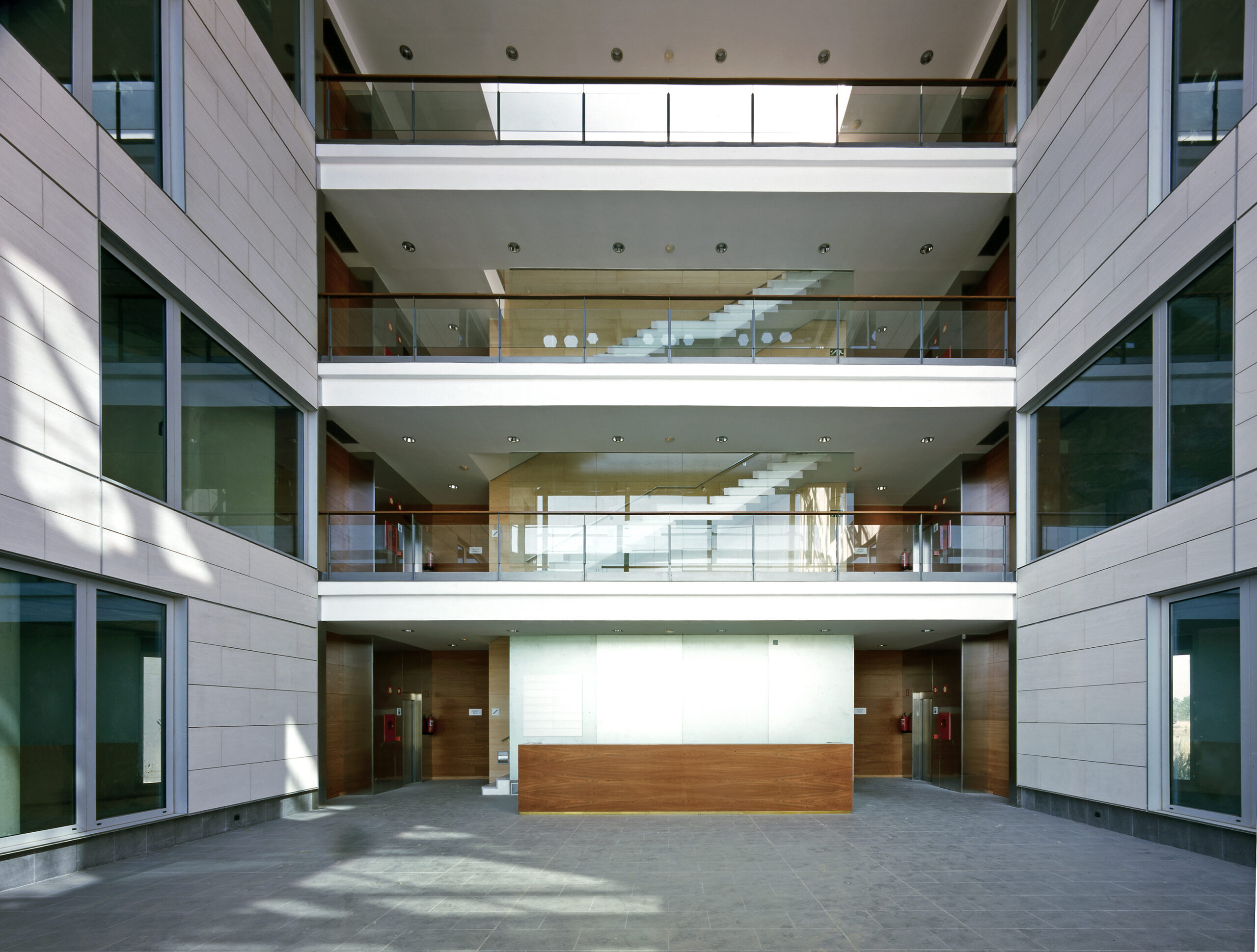The hall of the building, a cubic space and all the building high, constitutes the more significant element. This space, with totally glazed facades, is the functional and geometrical centre of the construction. Its yard character is reinforced by the fact that interior facades are a continuation of the exterior ones and both have the same finishing materials.
